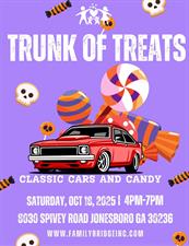 Come join us for our 4th Annual Trunk of Treats-Fall Festival for the Entire Family! This wonderful fall event is sponsored by Family Bridge, Inc., a nonprofit organization. Join the Fun this year with Music by DJ Device along with Food Trucks, Vendors, and Lots of treats. We hope to see you! laugh